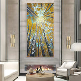Transform your space with the vibrant beauty of Amber Heights, a hand-painted oil masterpiece that captures the stunning ascent of golden-hued trees reaching towards the sky. Crafted using premium Winsor & Newton oil paints, this artwork boasts a vibrant color palette that brings the serene scene to life on high-quality canvas.