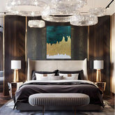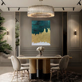 Crafted on high-quality canvas, Auric Veil showcases a vibrant color palette that resonates with sophistication and elegance. The textured layers of gold seem to cascade like a waterfall, while the emerald backdrop evokes a sense of calm and grandeur, making it a perfect statement piece for your home or office.
