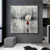 Immerse yourself in the elegance of Parisian Serenity, an exquisite hand-painted oil painting that captures the timeless charm of Paris. This artwork, featuring a striking red dress and umbrella amidst a serene Parisian backdrop, is meticulously crafted with Winsor & Newton Oil Paint, ensuring rich and vibrant hues that bring the scene to life.